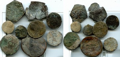 | For the last scan, a lot of the dirt has come off. The encrustation is dissolving on the darker coin. I am also adding the coins from the lighter fluid as well as the Formby's experiments, to see how they fare. You can see the before scans as the last scans on those pages respectively. | ||||||||||||||