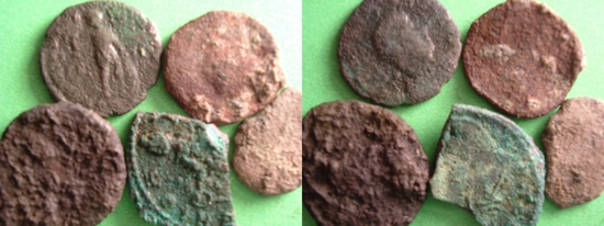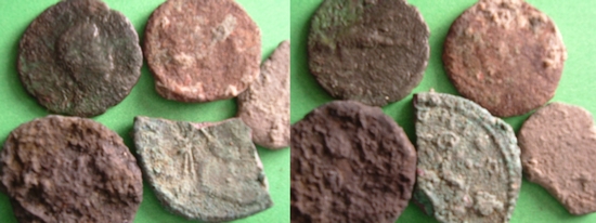 The top left coin has been renwaxed. The top right coin has some dirt, encrstations and small spots of patina. Bottom left coin is heavily encrusted. The broken coin has a decent green patina, but is encrusted (and broken). The small chip seems just dirty. This stuff burns my eyes- I have no idea what it is made of- nothing is stated on the label.