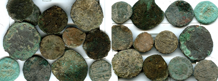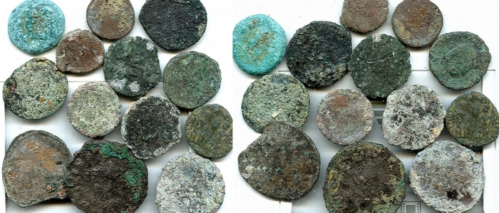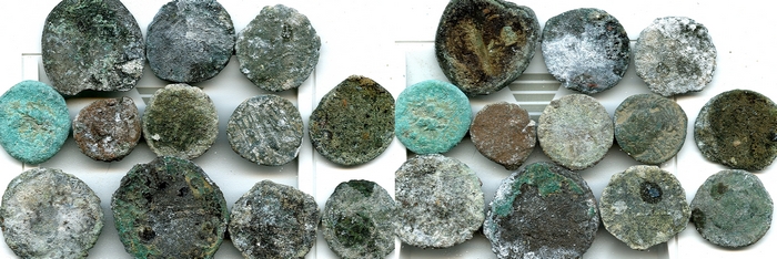 | Here's after another 30 hours or so. I added a tblsp of oxyclean every 10 hours or so. Coins now weigh 28.5g, so 0.3g of crud was removed. A good amount of the green encrustation on the Ant has been removed, and spotty silvering is now visible. Coins that show patina are still intact, but many of these coins seem to have been problem coins, so I'm not sure how good these were to test. Ah well, everything looks good at least, and dirt and encrustation is being removed. Back to the pot. | ||||||||||||||||||