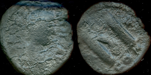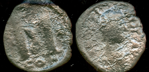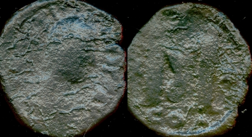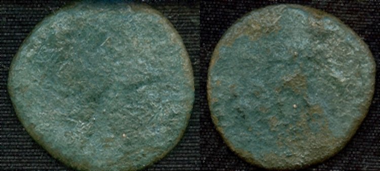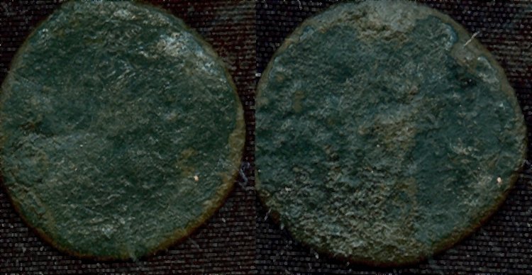 This is a coin that I was forced to remove the silvering from. It was quite hideous, and pretty much unattributable. Below the silvering was a patchy dark green patina in places, and others; bare metal. I initially used my assortment of blue/peach/red radial brushes, but they weren't having much effect. I stepped it up to yellow and reds, with better results, but found out it wasn't really the silvering that was the problem- it was the encrustation under the silvering that was making the coin a mottled blob. Even this combination wouldn't tear through this encrustation (it removed the silvering very easily though), so I dug out the Biox. Amazingly, after about 15 minutes, the Biox only removed maybe 60% of the encrustation.So I moved onto Nic-a-Lene Coin cleaner. It bubbled on the encrustations a bit, and I waited until it stopped bubbling, which was about 2 minutes per side.. Remember, don't get this stuff on your finger- it's burning a bit while I type this. Guess I should go rinse it off. I repeated adding drops onto the coin,twice on the obverse and thrice on the reverse, until I felt nothing else was going to be removed. I rinsed the coin thorougly, hit it with my red/yellow brush combo, silver brushed it, peach radial brushed it and finally let it soak in alcohol for 15 minutes. Here's what the coin finally ended up as. Sorry, I didn't take a before scan- I didn't expect this much work on it; I just thought it was the silvering that was the problem.