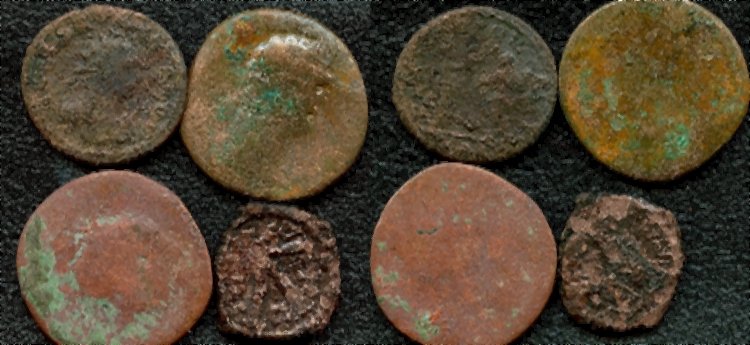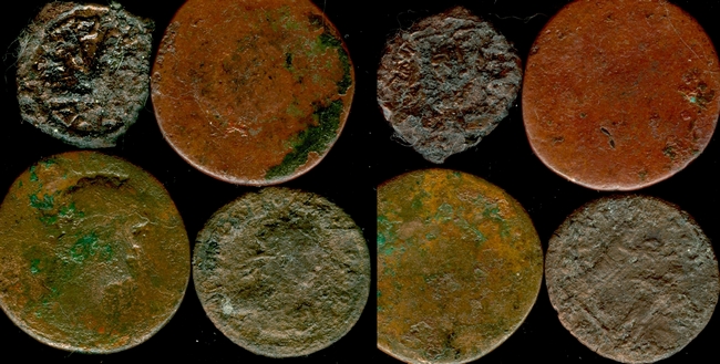 And here's 4 coins from my cull bin, that I normally sell on ebay once I get 100+ coins together. They're good for experimentation, and sometimes people will find something I have missed. I have an idea of what some of these are; but due to the condition, full attribution escapes me. These I am going to sit in my south facing window for a few days. I've read that this works well to let the Deller's set.