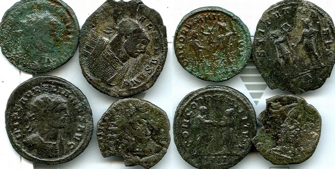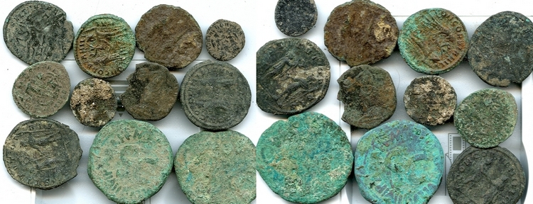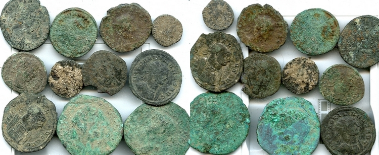 | Coins look much better in hand than scans (still haven't perfected scanning). I have no idea what the scan is picking up on the chipped coin, I don't see the dirt or whatever it is. Dirt on top right coin is silver, not dirt. Obverse of top left is porous, as well as the bottom reverse part from the green encrustation that I left. Bottom left coin has a chocolate brown patina, don't know where it is getting the patchy green from lol. The two large Ants came out beautifully. | |||||||||||||||||||