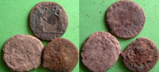 The coin in the top right corner was quite hideous, especially the reverse. I had tried everything except electrolysis on it- and I mean everything, with no effect- until lemon juice. The top left coin lost its silvering, but it's not pitted or such, and quite a nice coin in hand- even though it's bare metal. The bottom coin is the English cull- the reverse is still nice, the obverse is pretty rough. You can see some of the dirt remaining, it just won't come off- I've used picks, brushes and even the 3M, it just refuses to give. On the other coins that I've tried lemon juice on, the dirt pretty much slid off with ease.