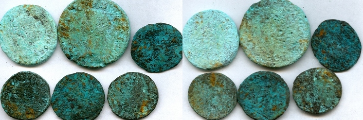 The "patina" doesn't seem to rub off, after I let them air dry. I'm not sure if I should risk trying to remove the mud or not. After drying, the coins look quite a bit more green than blue, as they did while zapping. I didn't throw them into vinegar, as Jerry of CZ suggests... I hate the smell of vinegar and can actually throw up by just smelling it. Not sure if it makes a difference in the coloring. The two large, totally stripped coins came out better than the Ants.