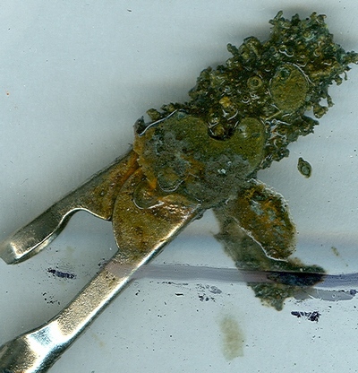 Reverse electrolysis is done by reversing the positive and negative leads for a short duration. I amgoing to use about 20 seconds. After each "burst", I'll move the alligator clips and repeat. I will do this 6 times, and see what happens.
