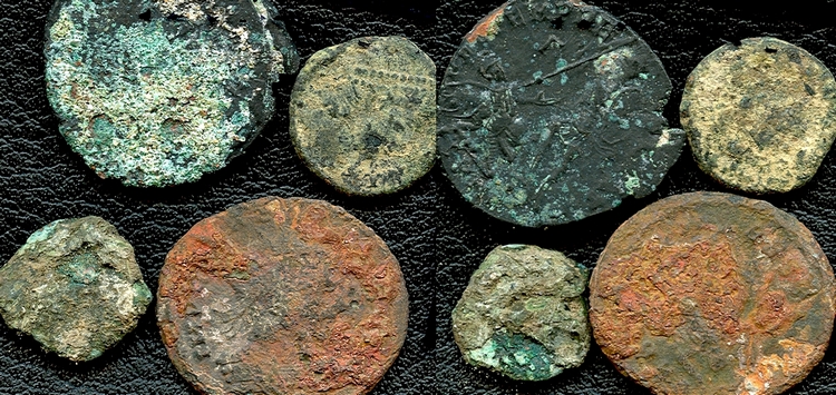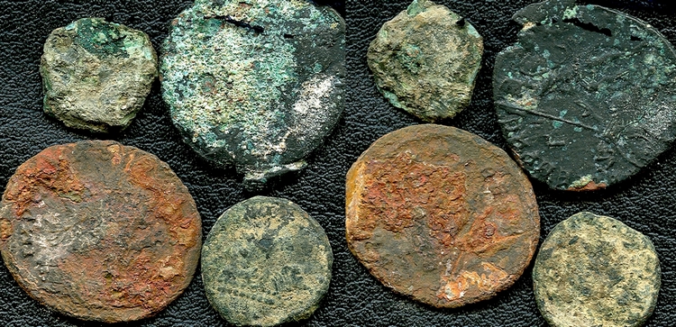 know. These coins weigh 12.3 grams initially, and have been soaking in distilled water for a couple weeks or so, to no avail. The one coin has bright blue and nearly flourescent orange crud on it, one of the small coins is heavily caked in dirt that won't let go and seems to have at least a partial patina, the other small coin has the dense clay that won't dissolve, and Fel Temp has some partial silvering on the reverse, but is plagued with green and white crystalline encrustation, mainly on the obverse. Let's see what it does. |