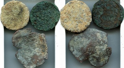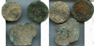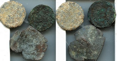 | It has soaked overnight, and there has been some definite changes. Wiped with a cloth, most of the dirt has come off. The top left coin has turned a yellowish color, and some of the dirt remains in the centers. No details are visible though. The top right coin has lost much of its dirt and some of the coral-like encrustation. Very little details visible so far and the patina is intact. Byzantine is nearly clean, though very little details visible. I picked some of the worst looking coins to try with this, since I thought the chemical would eat the coins up.This may warrant more experiments. I'll update with pictures perhaps tonight after work... and more soaking. | ||||||||||||||||||