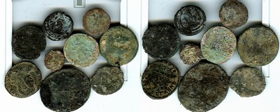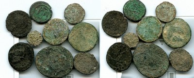 | Scan below shows the results after 2 more days of cooking; three days total. The Fel Temp has turned out woth odd colored patination. The large oblong coin in the bottom middle is starting to show details... it's one of the mid 250's rulers that I have yet to get a good coin of from uncleaneds. The Islamic has lost the blue coating. The middle left black coin is still pretty well coated with what reminds me of asphalt, but I can make out a helmeted bust left. The middle light green coin is also showing spotchy orangish patina like the Fel Temp. -I'm going to stick to plain distilled water next time... heat seems to have odd effects with Washing Soda. | |||||||||||||||||||||||||||