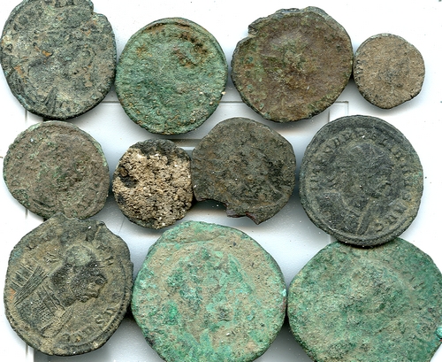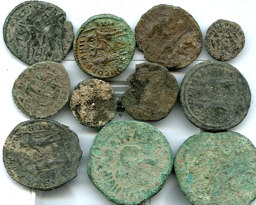 | Seems I am back on track. Coins lost 0.5 grams collectively over about 36 hours. A couple of these are done and only need a silver brush. I toothbrushed these to remove loose dirt, and there has been a drastic change in soil. A thing to note though, it seems that the coins that have green patina in this batch is not actually patina, it is a light encrustation. It feels like 60 grit sandpaper. The Augvstvs moneyer is losing some of this coarse "patina", as is the Clavdivs. I think you can see the coarseness pretty well in the pre scans above on the Concordia Militivm in the top row, center, so you can see what I'm talking about. It is dissolving, look at the pre and after shots on the same coin, especiialy the reverse. I will classify this as nothing but success! After only 36 hours, I am to the point where I'd expect to be after a week or so in normal soaking. Should receive more coins next week, to verify my results. | ||||||||||||||||||