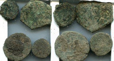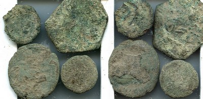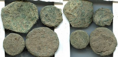 | After a couple hours, discernable dirt has been removed. The Byzantine and bottom right coins are starting to show nice detail. Encrustation is softening on the top two coins. Bottom left coin showing no difference... may be a cull. | |||||||||||||||||||||