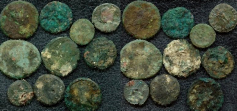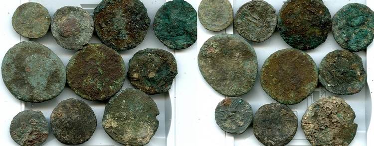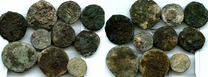 | Coins have soaked another week (8/17). I boiled the oil off in soapy water, and gave them a quick toothbrush. Coins now weigh 38.8 grams. Some dirt has been removed, and encrustations are being softened. I just broke a piece off with my fingers that was bugging me. Patinas seem to be darkened, but intact. 3 or 4 of these coins have the sandpaper texture, which is odd, since they came from a different source than the ones in my fishtank experiment, and I'm using totally different techniques with them. I don't remember this sandpaper texture on coins before, so either I didn't notice or the coins must be coming from a new region. This technique seems rather slow, but safe, and seems effective on encrustations. So if you like olive oil, I think this is quite a better choice. I'm getting better results, it doesn't cost as much, comes easily off the coins and doesn't seem to have harmful effects that I witnessed in my olive oil experiments. Back in the oil with these. | |||||||||||||
