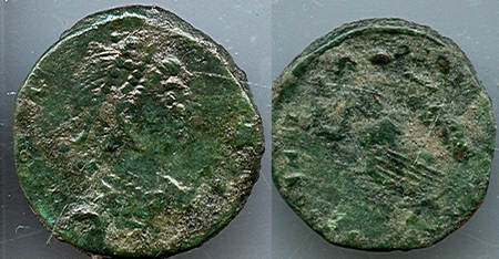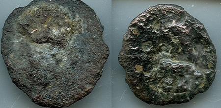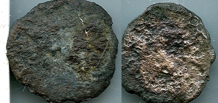 | Here's another hit with the 80 grit on a heavily encrusted coin that I had slated for electrolysis. Unfortunately it looks like a complete failure, but that is because the coin itself was quite beyond help. Pitting is quite evident, some of the encrustations proved to be metal spurs as well. But, the normal encrustations came off pretty easily. Perhaps 20 seconds was spent on each side, so this is a very fast process. | |||||||||||||||||||||||||||||
